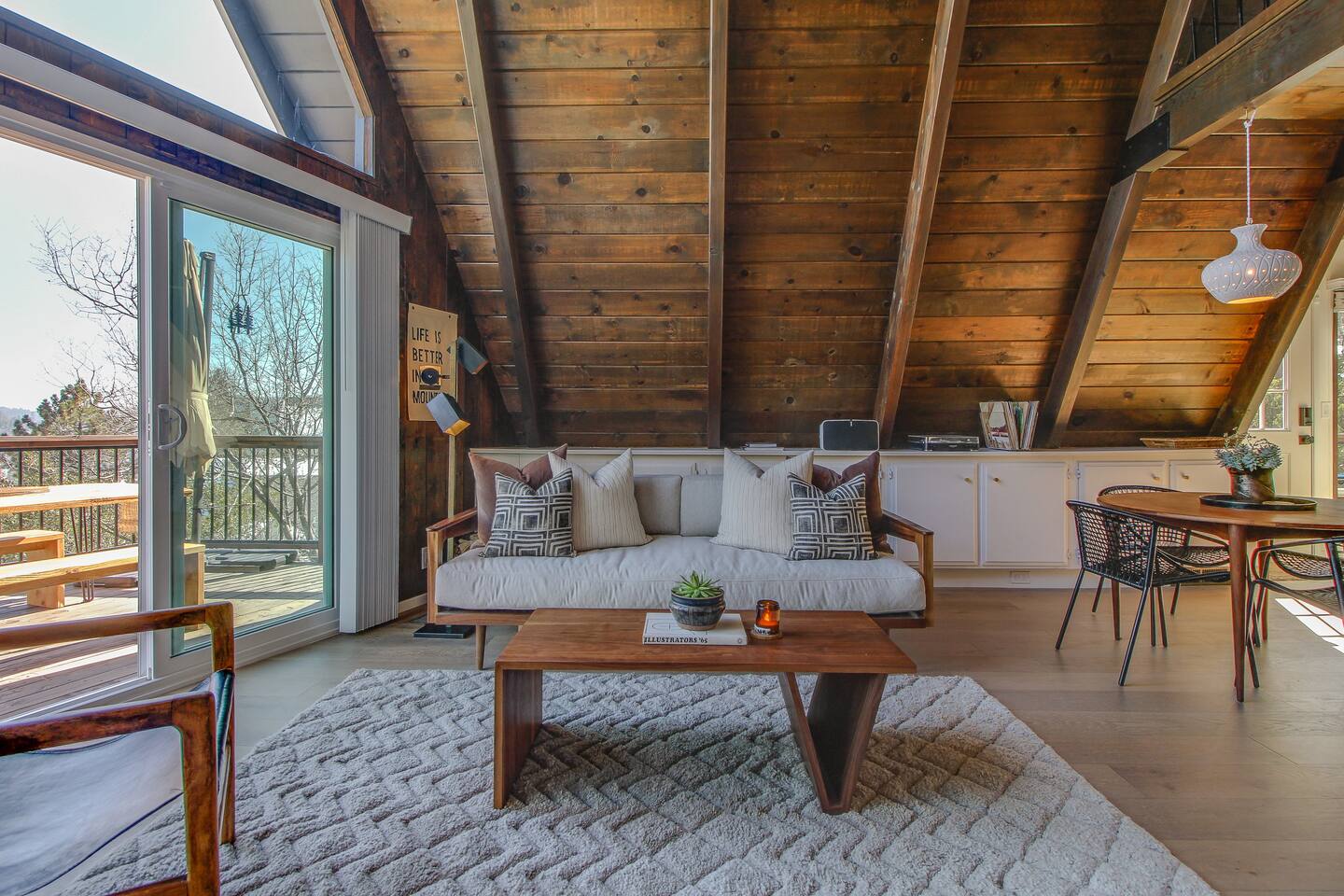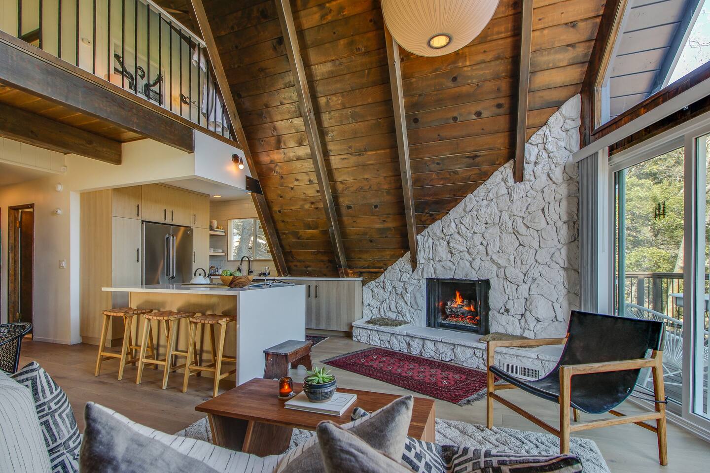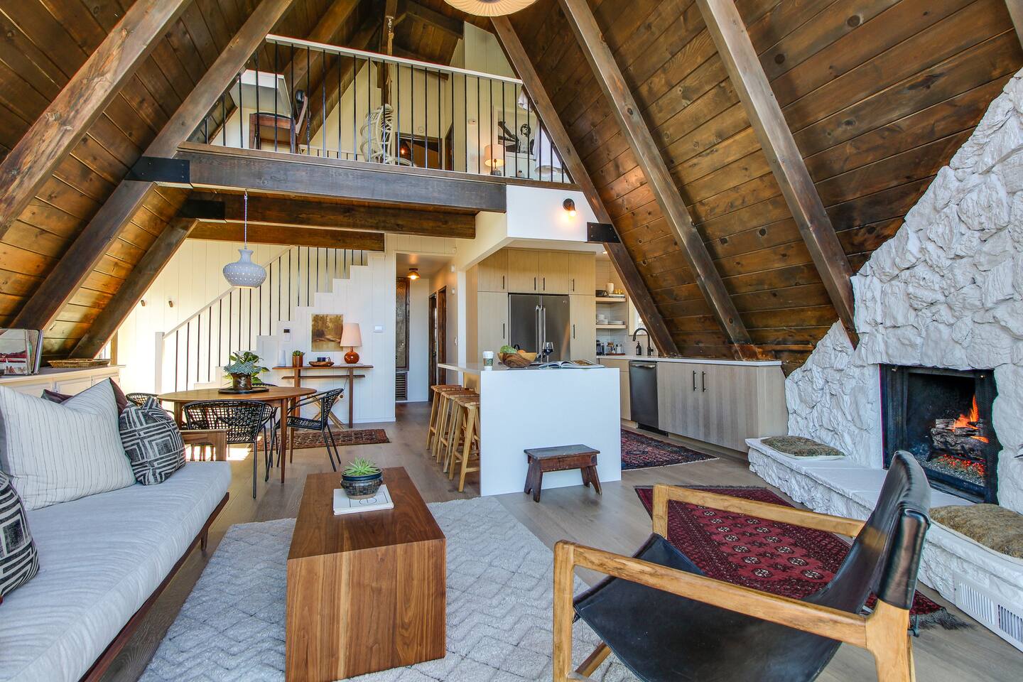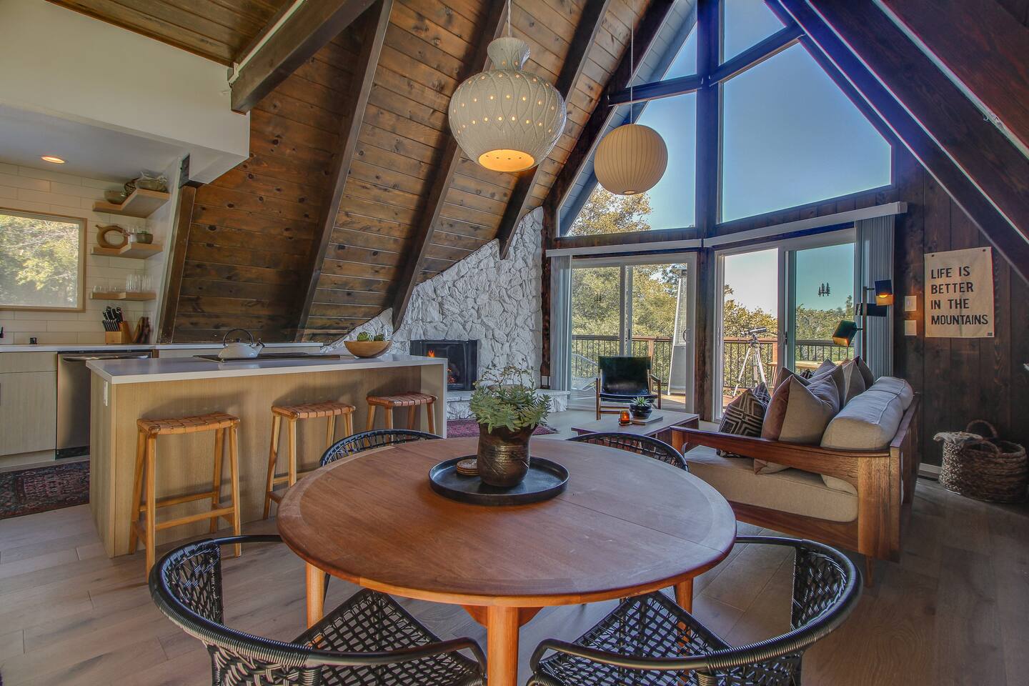 Roots Mountain House is a modern A-Frame escape with handcrafted furnishings and vintage touches. The open-concept living, dining, and kitchen area features stunning floor-to-ceiling windows with breathtaking views. With three stylish levels, there's plenty of space to relax and unwind. Enjoy comfort, design, and nature all in one place. Pet friendly with a $50 fee per pet—because your furry friends deserve a mountain escape too!