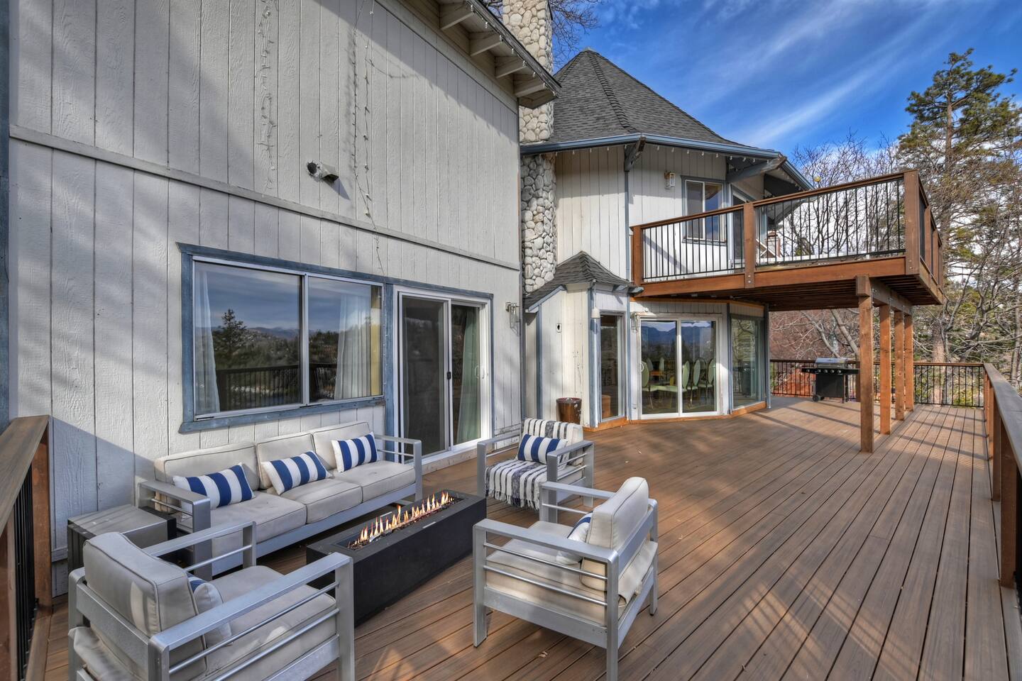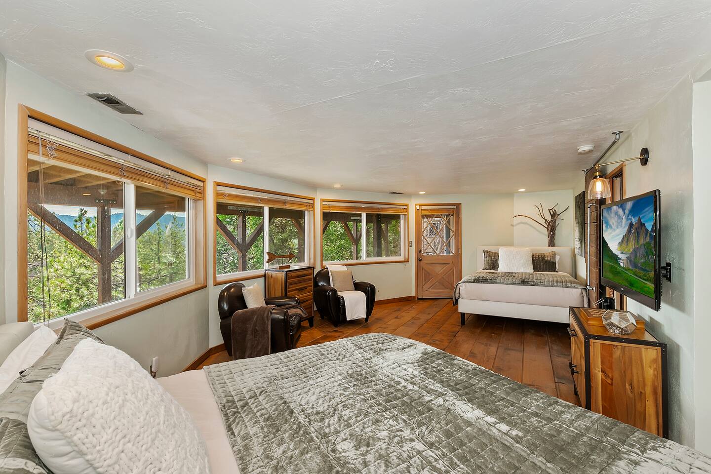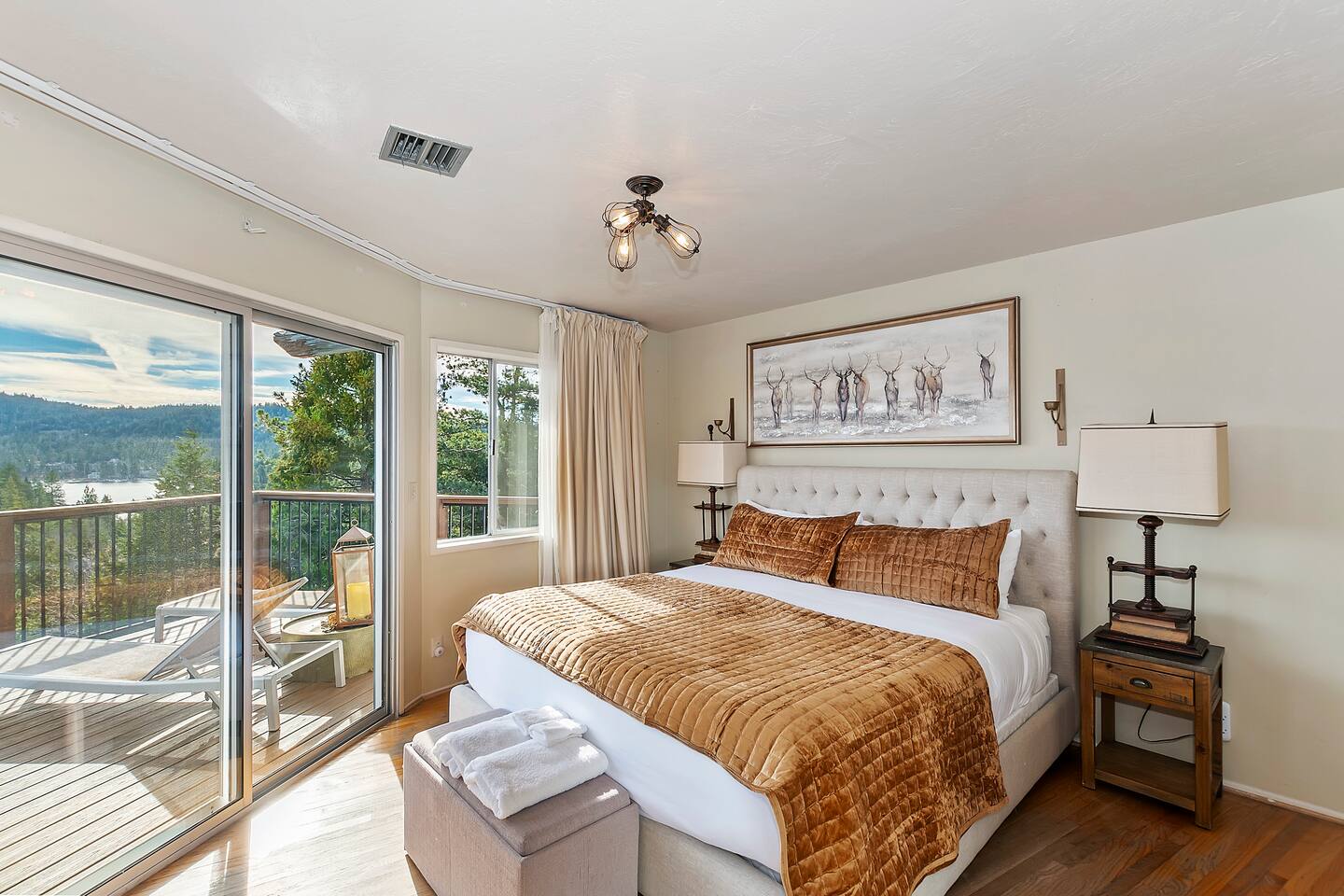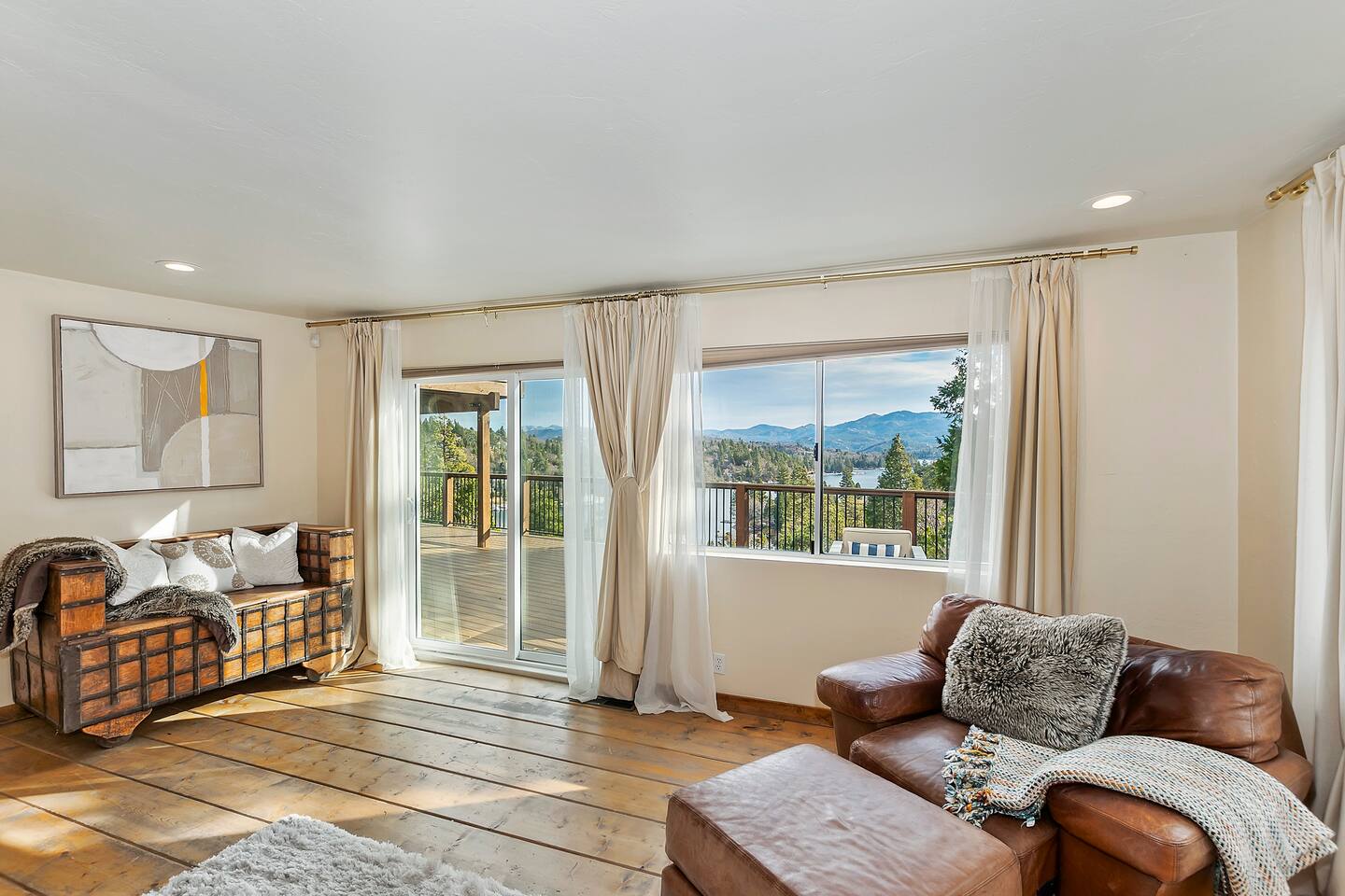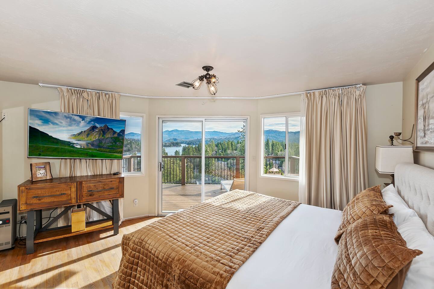 Main Living Space – The Iconic Octagon Cabin Enter into the original octagon cabin, full of charm and natural light Gourmet kitchen with stainless steel appliances, gas stove, dishwasher, and a dedicated coffee bar Dining area features a custom live-edge timber table that seats up to 10, with sweeping panoramic views of Lake Arrowhead Spacious living room with large sectional, Smart TV, and even more lake views Cozy wood-burning fireplace adds warmth and ambiance Convenient powder room located on this level Expansive Outdoor Deck Deck stretches the full length of the main level Enjoy lounge seating and a BBQ grill for outdoor cooking Perfect for soaking in the stunning lake views or entertaining guests Outdoor dining set arriving summer season Vintage Charm Meets Modern Comfort Custom staircase and architectural details throughout Sleeps 10 comfortably across 4 bedrooms 3 full bathrooms for convenience A harmonious blend of Hollywood history and contemporary luxury Whether you're relaxing on the deck, sharing meals with family and friends, or cozying up by the fire, the Ruth Hussey Estate offers a unique escape that captures the beauty and spirit of Lake Arrowhead. The lower bedroom accessed from the original circular staircase is a double large room, offering a king and queen beds, seating and TV area, also a full bathroom on this level. Upstairs top level, is the primary bedroom with a king bed, TV and YES more lake views, the private deck with chaise lounges to enjoy the breathtaking sight of the lake. The bunk room with custom built-in timber twins will delight anyone. One more bedroom with a queen bed and TV. Bathroom and powder room on this level. Garage parking for 2 and driveway 2 PLEASE do not BLOCK access road or park on any other area. Fines can be imposed by the county min $1000 and are the responsibility of the guests to pay.