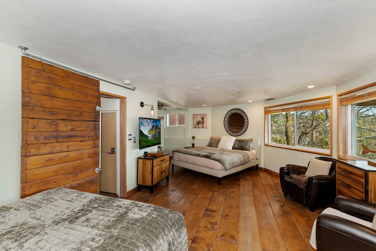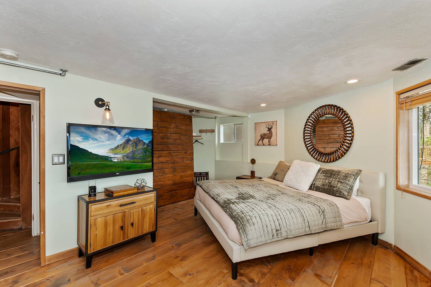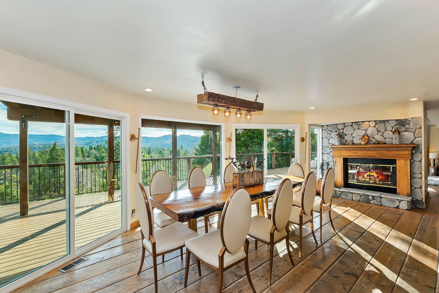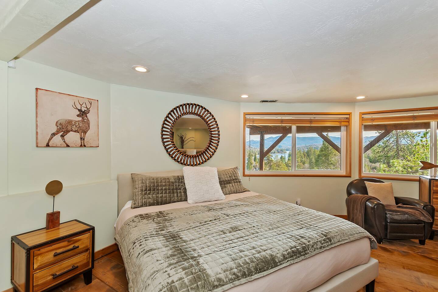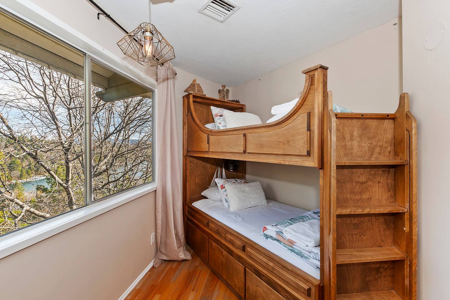 Main Living Space – The Iconic Octagon Cabin Enter into the original octagon cabin, full of charm and natural light Gourmet kitchen with stainless steel appliances, gas stove, dishwasher, and a dedicated coffee bar Dining area features a custom live-edge timber table that seats up to 10, with sweeping panoramic views of Lake Arrowhead Spacious living room with large sectional, Smart TV, and even more lake views Cozy wood-burning fireplace adds warmth and ambiance Convenient powder room located on this level Expansive Outdoor Deck Deck stretches the full length of the main level Enjoy lounge seating and a BBQ grill for outdoor cooking Perfect for soaking in the stunning lake views or entertaining guests Outdoor dining set arriving summer season Vintage Charm Meets Modern Comfort Custom staircase and architectural details throughout Sleeps 10 comfortably across 4 bedrooms 3 full bathrooms for convenience A harmonious blend of Hollywood history and contemporary luxury Whether you're relaxing on the deck, sharing meals with family and friends, or cozying up by the fire, the Ruth Hussey Estate offers a unique escape that captures the beauty and spirit of Lake Arrowhead. The lower bedroom accessed from the original circular staircase is a double large room, offering a king and queen beds, seating and TV area, also a full bathroom on this level. Upstairs top level, is the primary bedroom with a king bed, TV and YES more lake views, the private deck with chaise lounges to enjoy the breathtaking sight of the lake. The bunk room with custom built-in timber twins will delight anyone. One more bedroom with a queen bed and TV. Bathroom and powder room on this level. Garage parking for 2 and driveway 2 PLEASE do not BLOCK access road or park on any other area. Fines can be imposed by the county min $1000 and are the responsibility of the guests to pay.