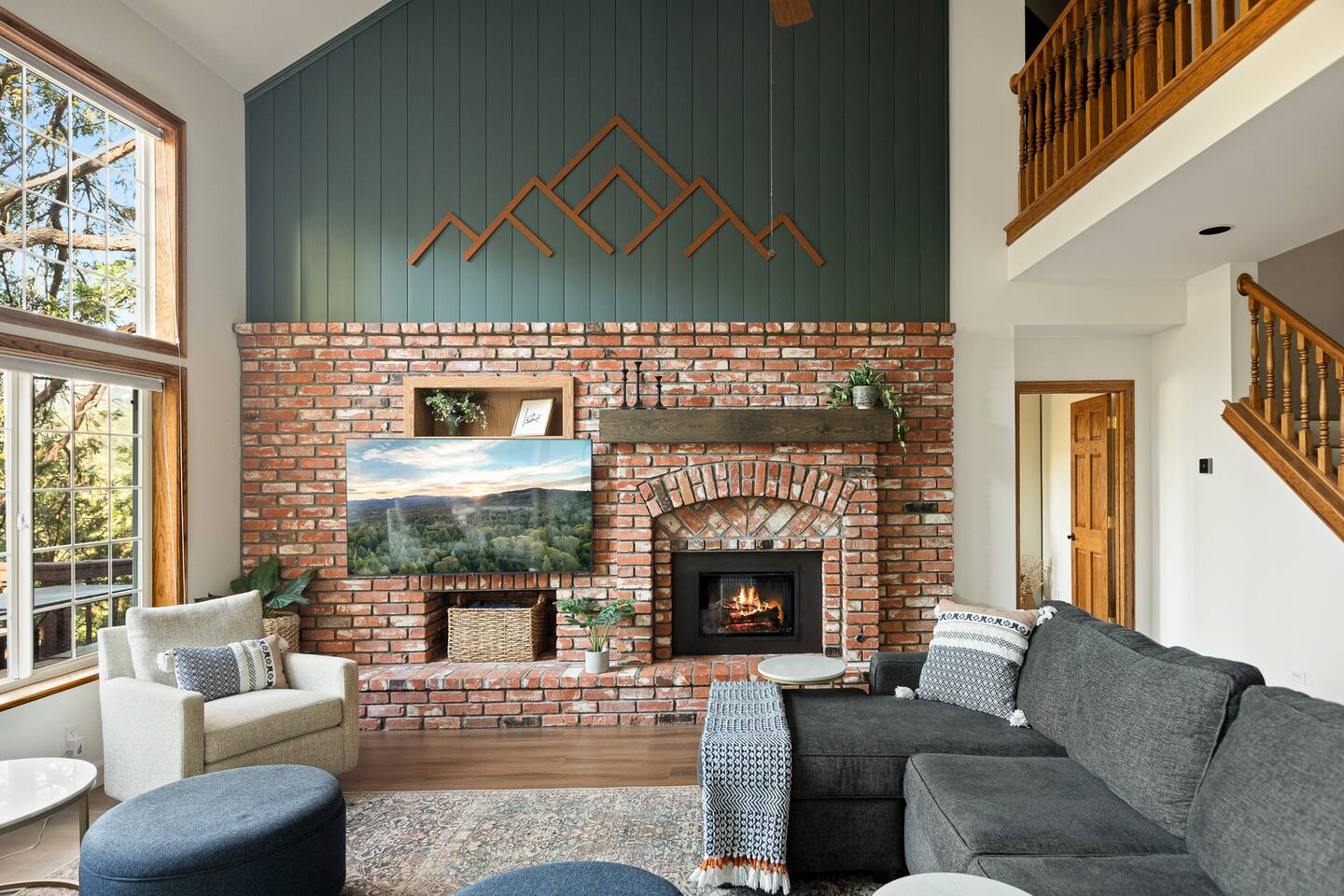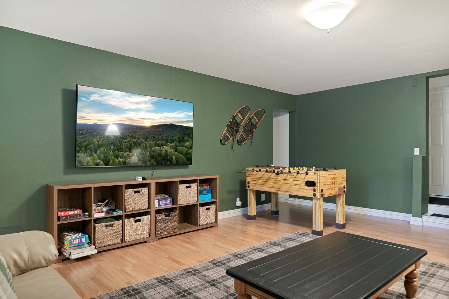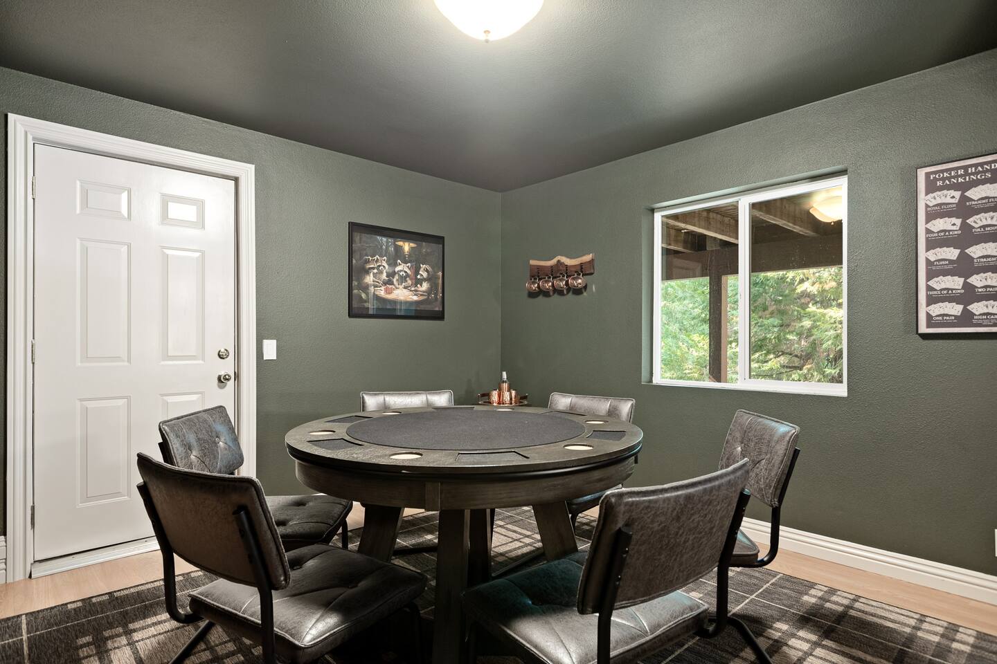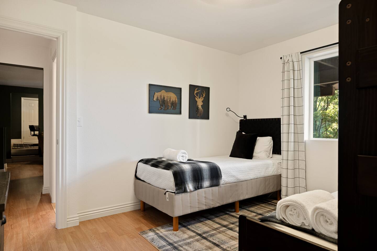 Classic cabin charm meets modern comfort across three levels of well-thought-out living spaces. ๐ Sleep & Comfort 4 total bedrooms + den and bunk room โ sleeps 10 comfortably Primary suite: King bed, walk-in closet, spa-like bath with soaking tub & walk-in shower Bedroom 2: King bed + private deck, perfect for morning coffee Bedroom 3: King bed + charming toddler โhideawayโ with fold-out beds Bedroom 4 (Lower level): Twin-over-twin bunks + full bathroom Den (Main level): Murphy bed + fireplace for extra sleeping space ๐ Living Spaces Vaulted-ceiling living room with electric fireplace + LG Smart TVs Open-concept dining area and breakfast nook Fully stocked kitchen for group cooking and family meals Office area perfect for remote work or study Laundry room with washer and dryer Direct access to garage for guest use ๐ฎ Entertainment & Extras Game Room: Large Smart TV, cozy seating, stylish decor โWhisky Denโ: Themed hangout with a poker/card table โ BYO whisky! Hide-and-seek approved toddler hideaway nook upstairs Strong Wi-Fi throughout the home ๐ฒ Outdoor Features Multiple decks with forest views BBQ grill + outdoor seating for relaxed meals Level-entry from driveway โ no stairs required for access Room for up to 4 cars parked on-site ๐ซ Good to Know No pets allowed Quiet hours and respect for neighbors are appreciated Perfect for families, remote workers, or small friend groups