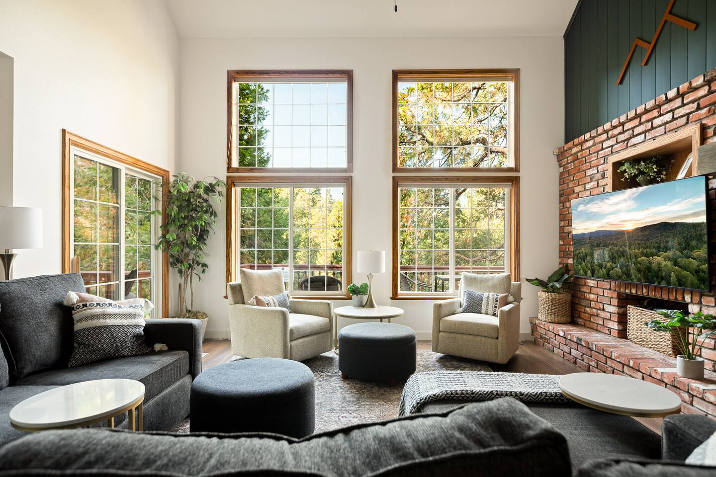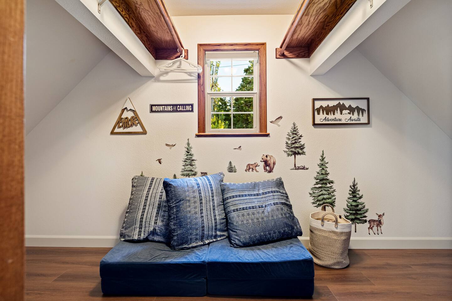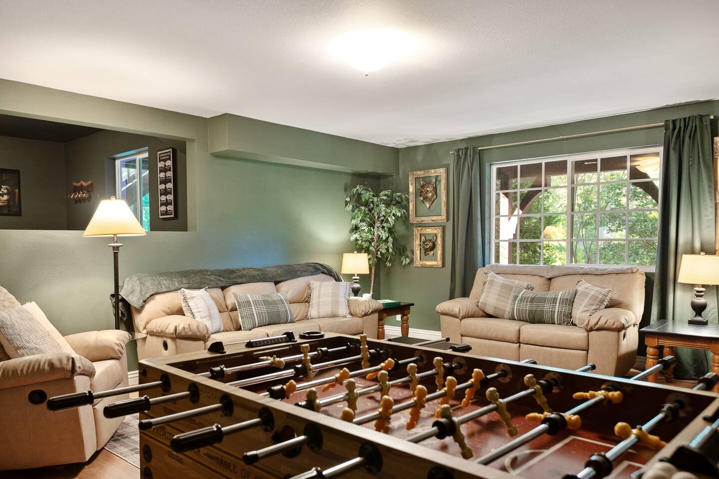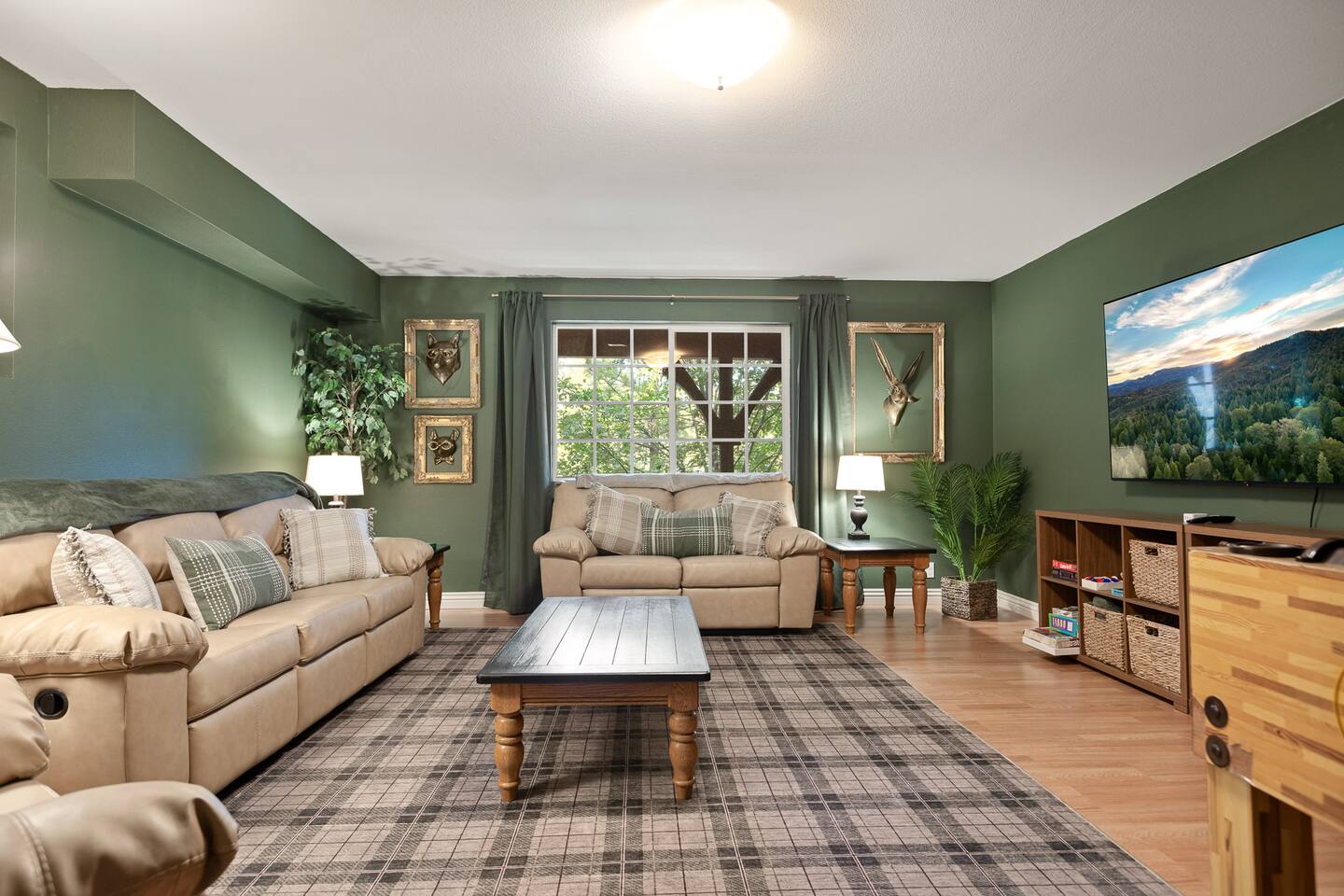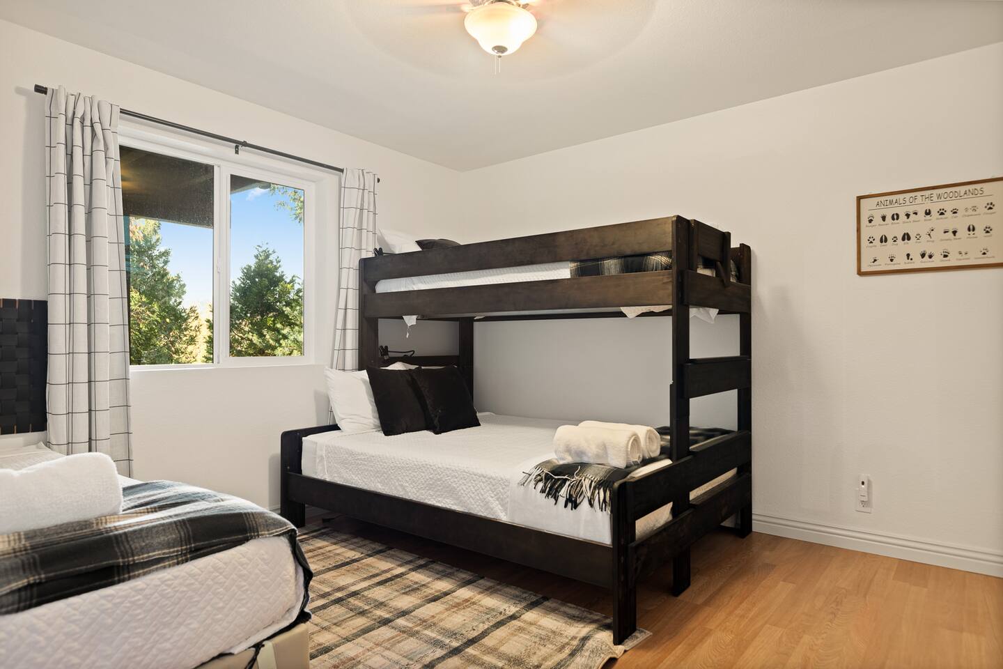 Classic cabin charm meets modern comfort across three levels of well-thought-out living spaces. ๐ Sleep & Comfort 4 total bedrooms + den and bunk room โ sleeps 10 comfortably Primary suite: King bed, walk-in closet, spa-like bath with soaking tub & walk-in shower Bedroom 2: King bed + private deck, perfect for morning coffee Bedroom 3: King bed + charming toddler โhideawayโ with fold-out beds Bedroom 4 (Lower level): Twin-over-twin bunks + full bathroom Den (Main level): Murphy bed + fireplace for extra sleeping space ๐ Living Spaces Vaulted-ceiling living room with electric fireplace + LG Smart TVs Open-concept dining area and breakfast nook Fully stocked kitchen for group cooking and family meals Office area perfect for remote work or study Laundry room with washer and dryer Direct access to garage for guest use ๐ฎ Entertainment & Extras Game Room: Large Smart TV, cozy seating, stylish decor โWhisky Denโ: Themed hangout with a poker/card table โ BYO whisky! Hide-and-seek approved toddler hideaway nook upstairs Strong Wi-Fi throughout the home ๐ฒ Outdoor Features Multiple decks with forest views BBQ grill + outdoor seating for relaxed meals Level-entry from driveway โ no stairs required for access Room for up to 4 cars parked on-site ๐ซ Good to Know No pets allowed Quiet hours and respect for neighbors are appreciated Perfect for families, remote workers, or small friend groups