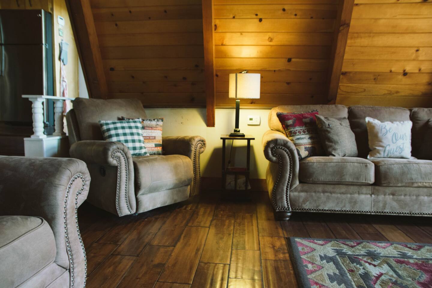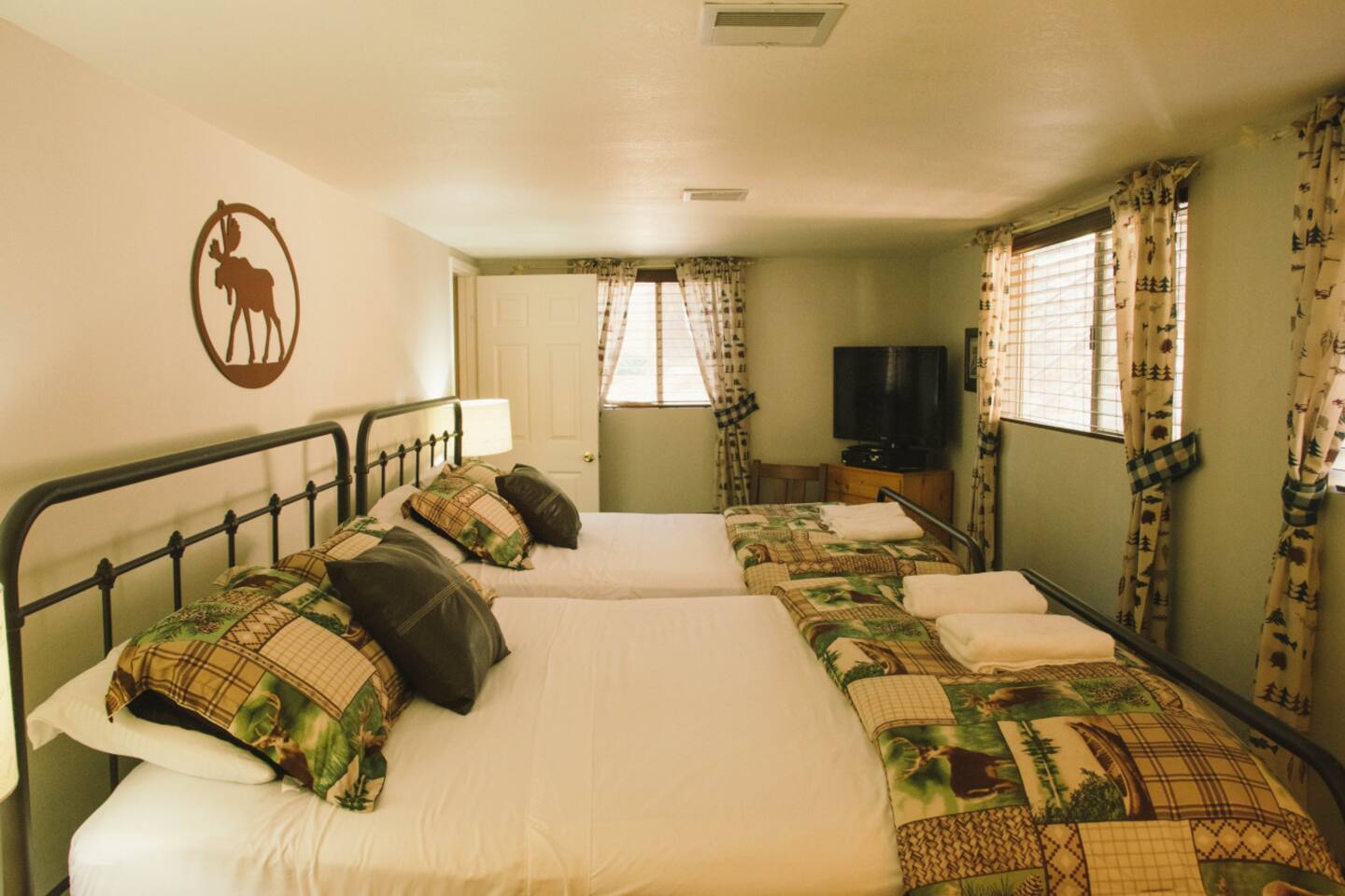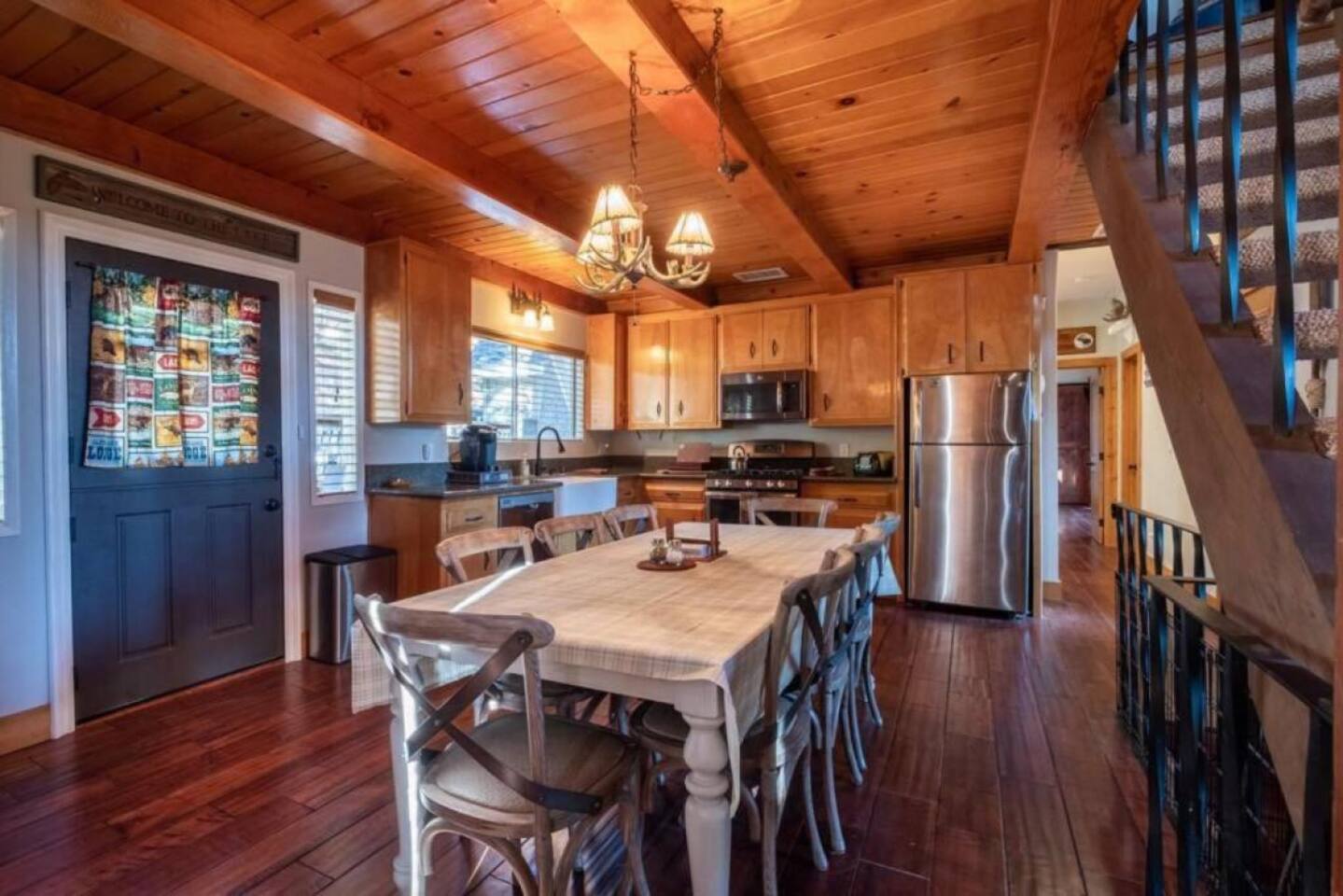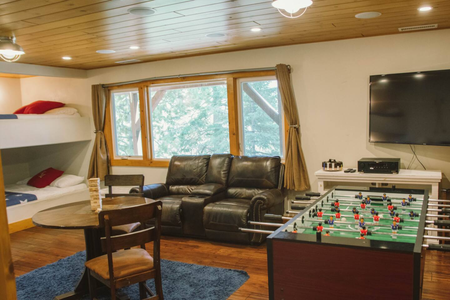 INTERIOR 🔥 Living Room: Bright open-concept with fireplace, plush seating, and woodsy views 🍽️ Kitchen & Dining: Fully equipped for group cooking, plus dining area for shared meals 🎮 Game Room: Massive entertainment zone with games, bunk beds, and Smart TV 📺 TV Setup: YouTube TV, Rokus (no cable), fast Wi-Fi SLEEPING 🛏️ The Moose Caboose: Main-level primary suite (1 king) – stair-free access 🛏️ The Nut House: Themed bunk room (2 twins, 2 queens) + Smart TV 🛏️ The Bear’s Den: Spacious queen bedroom 🛏️ Big Moose Room: Double queen bedroom 🛏️ The Owl’s Perch: Loft bedroom with a queen bed & serene treetop views 🛁 Bathrooms: 3 full bathrooms spread across levels for convenience COMFORT ❄️ A/C: Yes – note: two lower rooms do not have A/C but stay naturally cool 🧺 Laundry: Washer & dryer available 📦 Gas Grill: Direct line – no propane tanks needed 🔒 Owner Closets: Some storage spaces are reserved OUTDOORS 🌞 Back Deck: Private, spacious, and surrounded by trees – ideal for morning coffee or group dinners 🔥 Views: Enjoy elevated forest scenery and peaceful outdoor space 🚗 Parking: Max 4 cars in driveway – no street parking per county rules