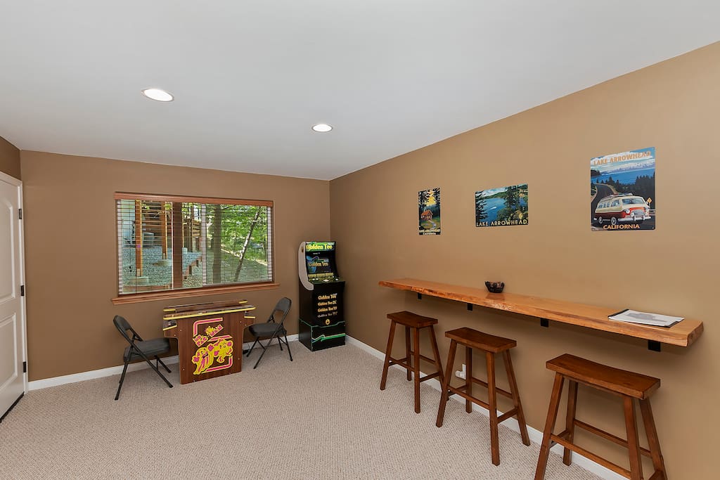 Every corner of the home is designed for comfort and connection: · 5 bedrooms, including a master suite with jetted tub + walk-in shower · Cozy living room with fireplace for relaxed evenings · Pool table room with its own fireplace · Family room with large TV · Game room with Ice Ball, Pac-Man, and arcade golf · Fully equipped kitchen for group meals · Two expansive decks with seating, BBQ, and outdoor fireplace The Bedrooms Each bedroom is spacious and thoughtfully furnished, with soft bedding and plenty of room to recharge after a day in the mountains. Location Perks Nestled in the pines, you’ll be just minutes from all the best of Lake Arrowhead: · Lake Arrowhead Village for shopping, dining & events (10 min) · Hiking trails and outdoor adventures nearby · Short drive to SkyPark at Santa’s Village (15 min) · 30 minutes to Snow Valley Mountain Resort for skiing & boarding Backyard Vibes Two oversized decks provide the perfect spot for group barbecues, evening cocktails, or cozy fireside chats under the mountain sky. ✅ The Perks · 5 bedrooms, 3.5 bathrooms — room for everyone · Pool table + arcade-style game room for endless entertainment · Multiple fireplaces indoors & outdoors · Expansive decks with BBQ + outdoor fireplace · Close to Lake Arrowhead Village, SkyPark, and Snow Valley